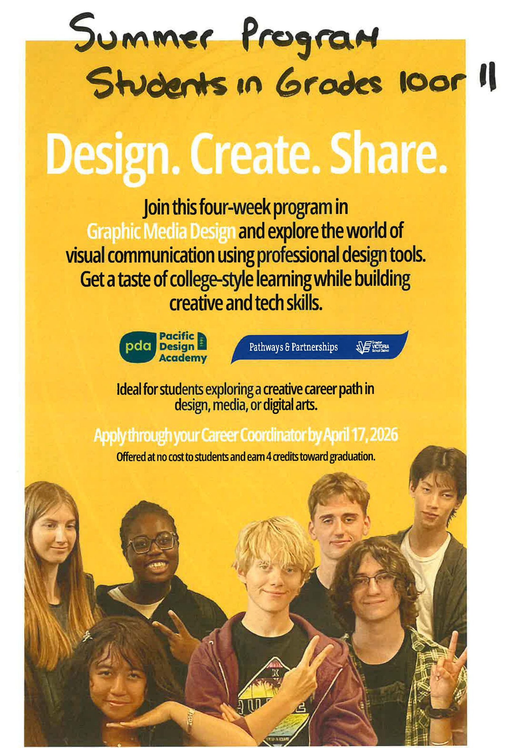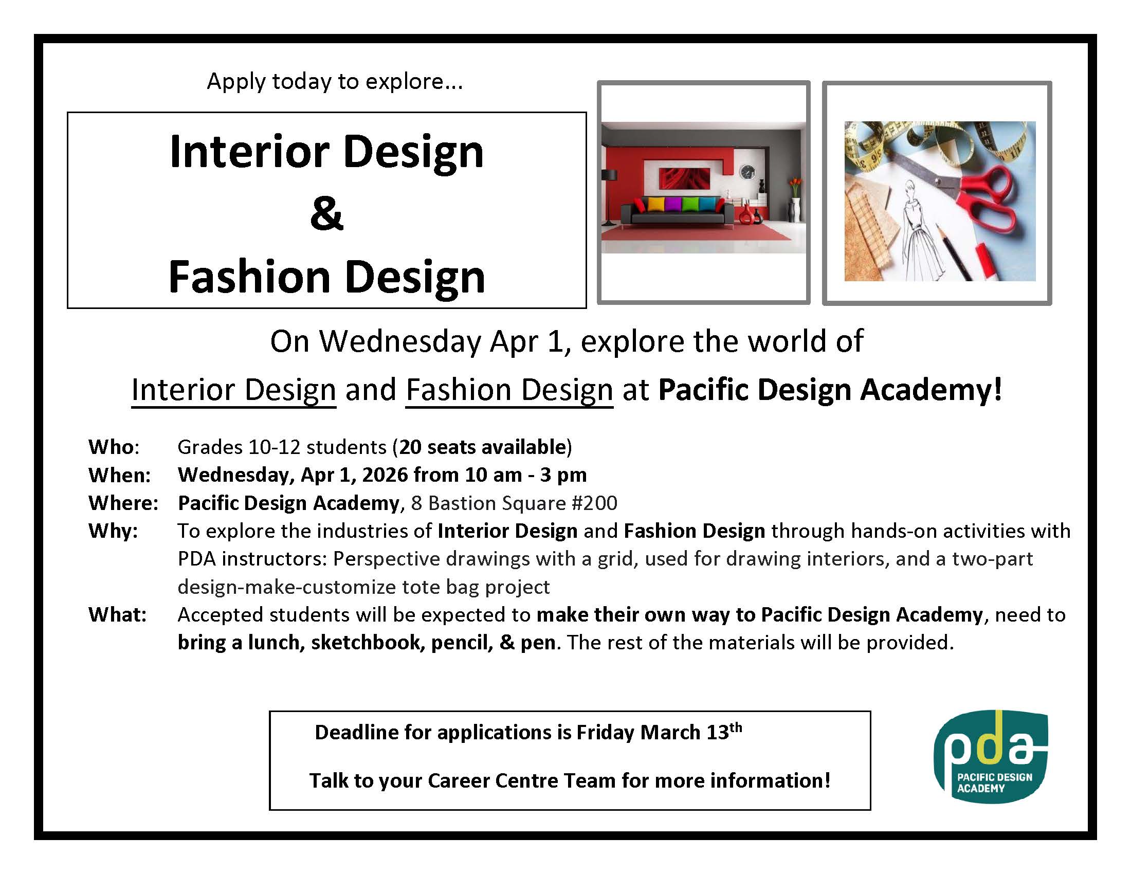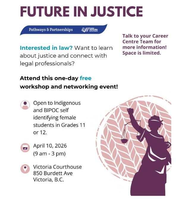 Dream It Be It – Tues. March 3. Deadline: Feb 27. For young women, transgender and non binary youth aged 15-25. Free. Workshops: Confidence over Pressure, or Explore, Create with AI, Empowering 1st time renters, Building Strong & Healthy Relationships, Job Search Strategies and more – Sign up with Ms. Croucher or Mr. Neal in the career centre.